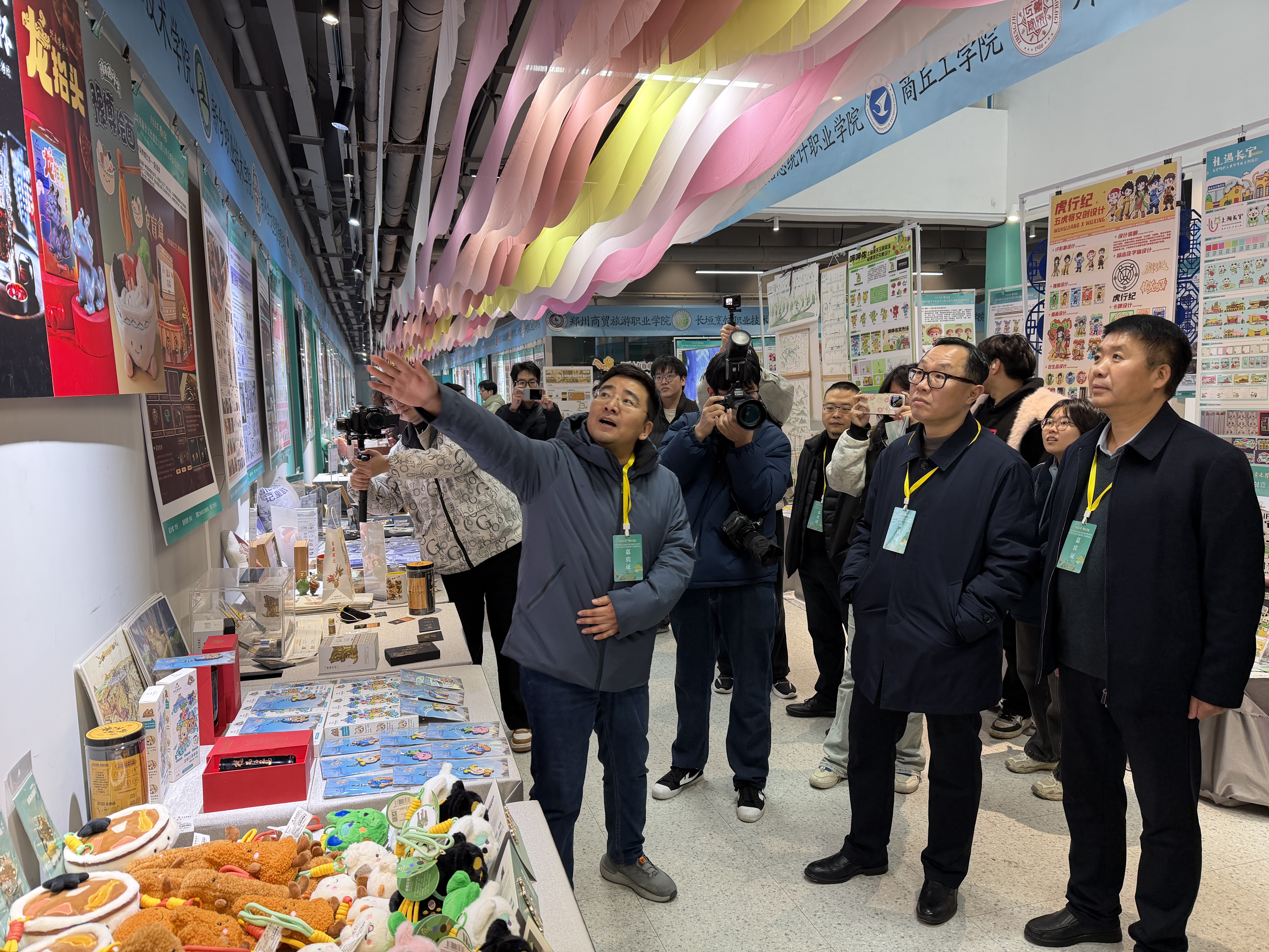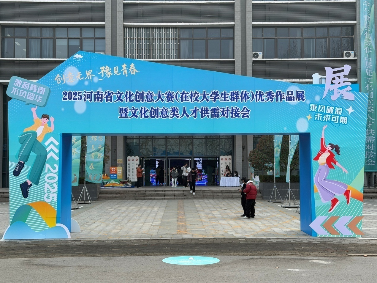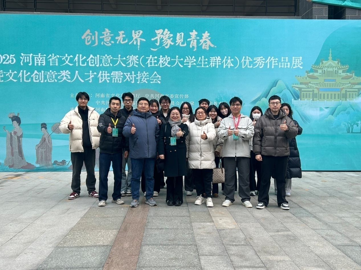 12月19日,2025河南省文化创意大赛(在校大学生群体)优秀作品展暨文化创意类人才供需对接会在河南牧业经济学院龙子湖校区举行。本次活动由河南省教育厅联合省委宣传部、省委网信办、省文旅厅共同主办。我院副院长葛露带队参加,随行人员包括工业设计系主任焦斌、教工第三党支部书记张丽娟、教工第四党支部书记李抒音、环境设计系副主任吴鹏、动画系专业负责人岳婧雅、以及本科生、硕士研究生代表。省教育厅、省委宣传部、省委网信办、省文旅厅等相关处室负责同志,以及河南牧业经济学院校长尹新明、副校长马珺莅临现场观展指导,并与参展师生、行业专家及企业代表进行了深入交流。